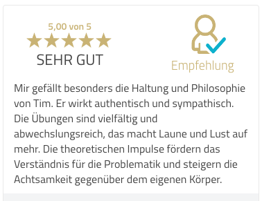 Laut seinen Teilnehmern ist Tim eine Inspiration und Bereicherung. U. a., weil er mit völlig anderen Augen auf viele Gesundheitsthemen blickt. So können alle Teilnehmer von den vermittelten Inhalten und Übungen profitieren. Eines seiner Steckenpferde ist die ganzheitliche Betrachtungsweise gesundheitlicher Probleme. Der Rundumblick auf Körper, Geist und Seele ist seiner Meinung nach essenziell, um in eine gesunde und unbeschwerte Zukunft zu starten.
